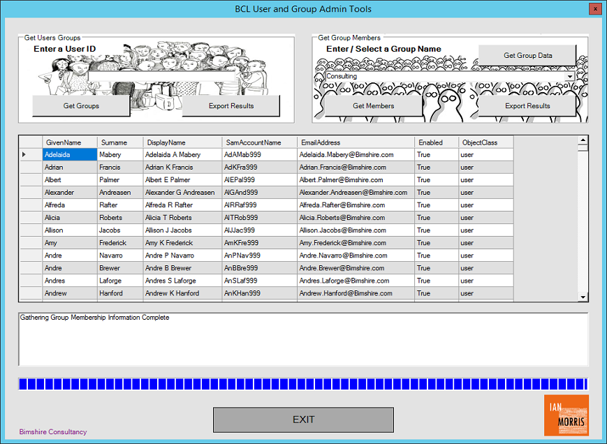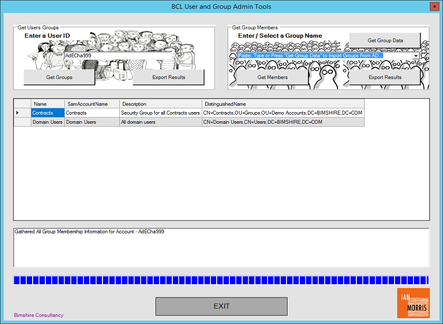 This little app will enable quick analysis of the results to see if the user they are assisting is in the correct groups etc. If you need to send the results to a 3rd party; simply click the 'Export Results' button to produce a csv report. To make it easier to run these scripts, I package them into an installable .exe file. This means the 1st, 2nd staff just have to double click the exe file to install and run the program.